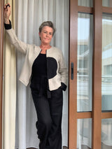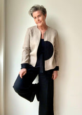 Amanda jakken er en litt "typete" jakke. Den er sydd i et stødig linstoff med en sort bue i front. Jakken har glidelås i sort og samme farge er tatt opp som en fin detalj nederst på ermene.