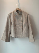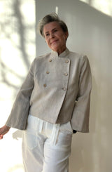 Fanny jakken er en dobbeltspent jakke. Det er en kul jakke med trompetermer og en liten halslinning. Den leveres i et stødig linstoff. Fanny jakken passer utmerket til dine favoritt jeans eller linbukser.