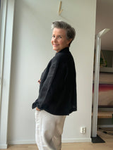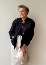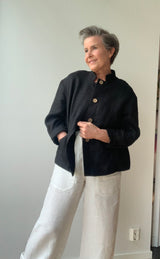 Sofia jakken er til deg som liker jakke med vidde. Den er sydd i 100 % europeisk lin. Jakken har stolpe med knapping i forkant. Liten halslinning og med fold i ryggen som gir den rikelig vidde over hofte/ mage