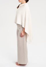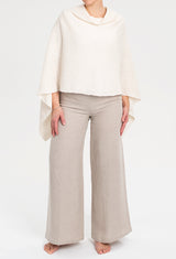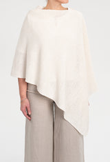 Ponchoen er en av mine favoritter. Herlig å ha med seg på reiser. Rull den sammen og putt den i veska eller kofferten. Ponchoen kan brukes til et hvert antrekk. Den er strikket i blandingen 70% lin og 30% bomull og har derfor en tyngde som gjør at den «faller» fint.